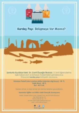 11 Şubat 2016 tarihinde HEKVA Gençlik öncülüğünde sponsorlar ve gönüllülerden alınan destek ile Şanlıurfa Eyyübiye’deki Dr. Cavit Özyeğin İlkokulu 3. Sınıf öğrencilerine “Kardeş Payı Projesi” kapsamında kışlık mont, bot ve kırtasiye materyalleri hediye edilmiştir.